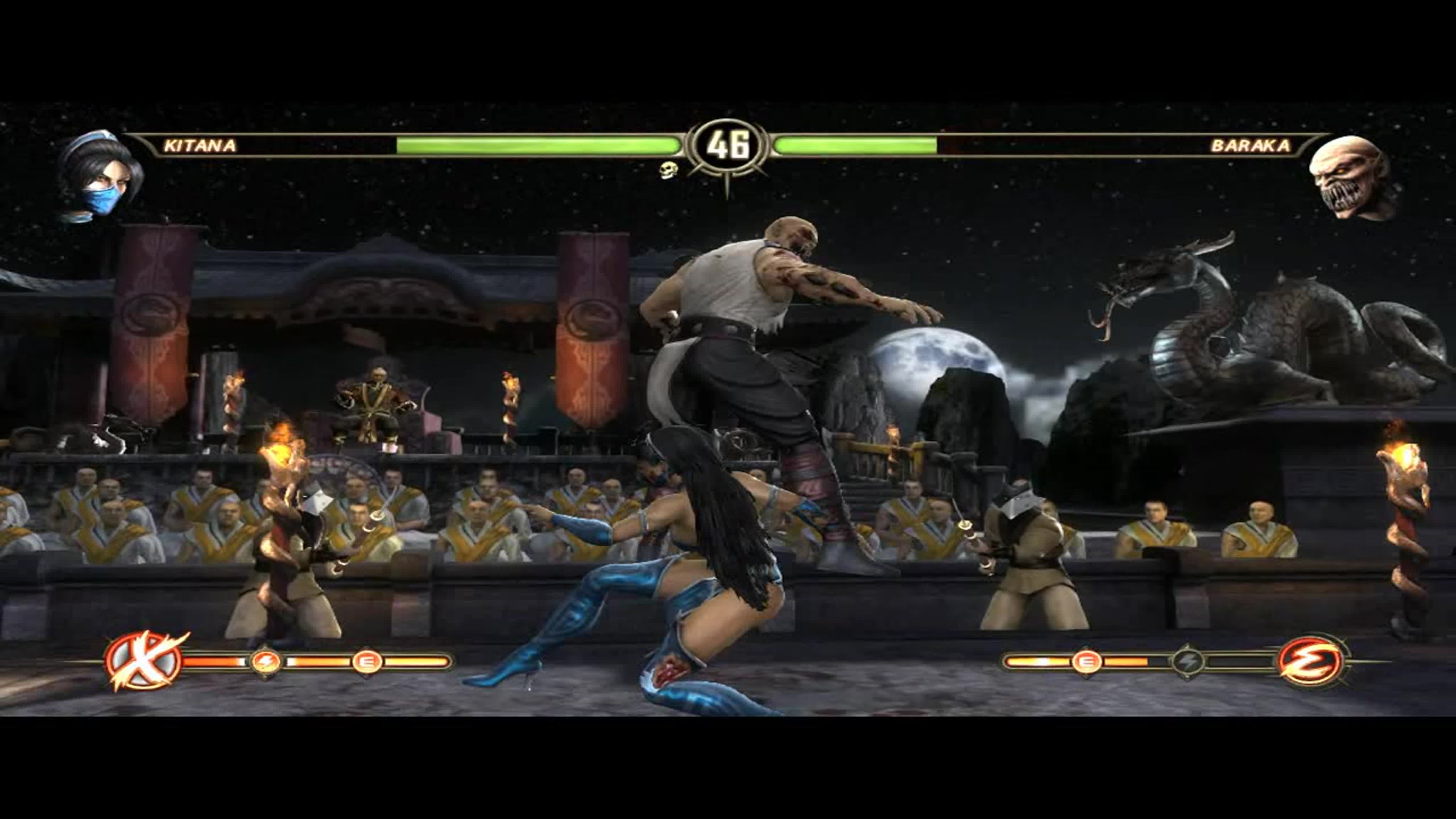 Китана бьется с Синдел, Баракой и Смоуком.